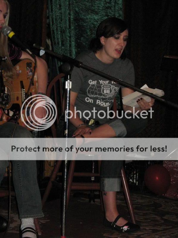 That I also got to see Eryn and Nick rehearse as A River Rise, the acoustic band that would be playing with me during my reading on Sunday. I was hugged by both of Eryn's parents when I entered their house (where Eryn and Nick rehearse) because they felt they knew me so well. They are both extremely sweet people. Eryn's mom insisted on making Nick a grilled cheese sandwich when he mentioned he was hungry. And Eryn's dad heard me practice my reading and expounded on how awesome my adjectives are. But by far the most impressive thing that day was seeing Eryn sing and play for the first time. I mean, I'd heard her fuck around before on my guitar, but we were drunk and she was doing covers. To hear her and Nick do a song they had written called "The Pretty Girls You Meet," I seriously almost cried because she amazed me so much. She's just that good. And the song kept getting stuck in my head so the last night I was there, I drunkenly made her and Nick play it for me so I could record it. Please note that Eryn was drunk while playing this and she still totally rocked it. Nick was the sober one that night (thank you for being the DD, Nick!). I wish I could have recorded the first time I heard it to capture that moment and share it with you, but this will do:
